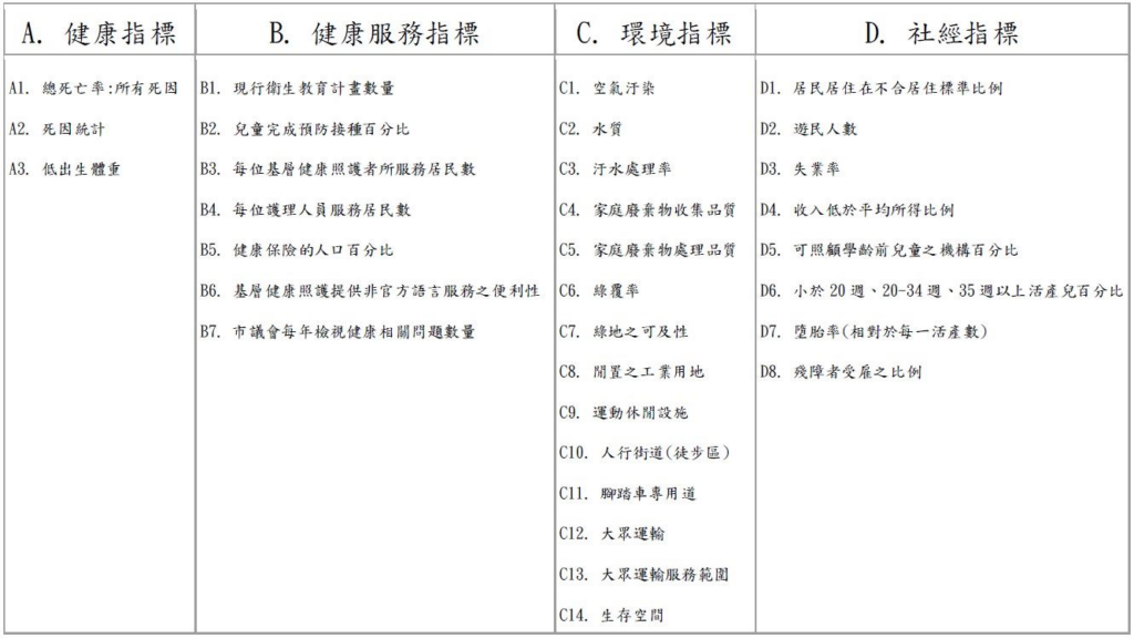 健康指標是人口質量的一些可量化特徵,在社區健康工作的任何一個週期,實施過程都會產生各種數據,經過有意義的分母分子計算,可以制定許多健康指標,用以反映改善健康和福祉的進展情形,作為描述人口健康狀況的支持證據。 通常,研究人員會使用調查方法收集有關人口樣本的信息,使用統計數據試圖將收集到的信息推估到整個人口,然後使用統計分析來做出有關人口健康狀況的陳述,健康指標可以用來指導或制定醫療保健政策。作為一個社區整體計畫的,健康指標可以涵蓋整個或部份生命週期的人口,也可以用在單一主題或跨主題領域的目標。