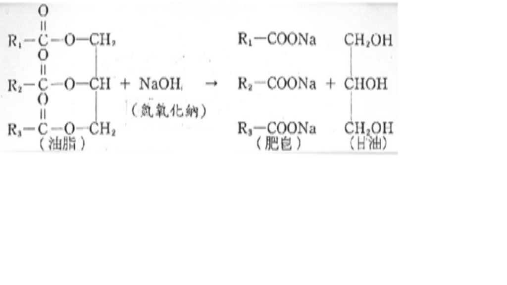 至於肥皂的製造就是油脂加鹼做出肥皂(脂肪酸金屬鹽),這樣的過程叫皂化(saponification),其化學反應如下: