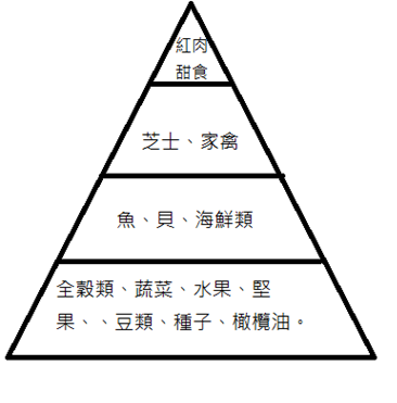 地中海飲食是指地中海週邊,大約是希臘,義大利,西班牙附近人民的飲食,它的內容為: 大量的蔬菜,水果,全穀類,堅果,種子,豆子以及橄欖油等,中量到少量的魚,禽肉,乳製品等,而紅肉,甜食則是幾乎沒有。至於紅酒是適量在餐中飲用。詳細的內容(事涉版權)請上網參閱,只要輸入關鍵字:地中海飲食即可。 地中海飲食金字塔中(圖一), 最下層表示最多,越上層表示越少。