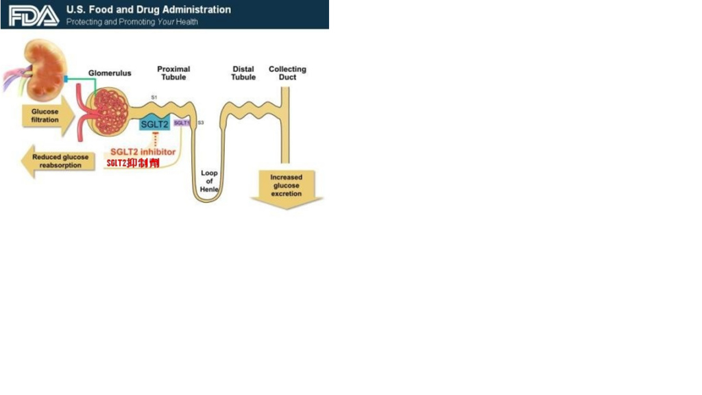 過去所使用的各類藥物幾乎都是聚焦在增強胰島素的生成和提升胰島素的效能在研發,但這 最新出品的藥物(稱之為SGLT-2抑制劑)則跳脫以往的思緒, 不管胰島素,改以作用於腎臟來減少近曲腎小管回收尿液中的葡萄糖總量(糖份對身體算是好東西,正常的腎臟會將它回收再利用),直接將多餘的糖分從尿液中排出而降低血液中的糖分。簡單一句話來說就是「這藥會讓糖份直接從尿液排出」,聽起來是不是很神奇?下圖是SGLT-2抑制劑的作用機轉圖。
