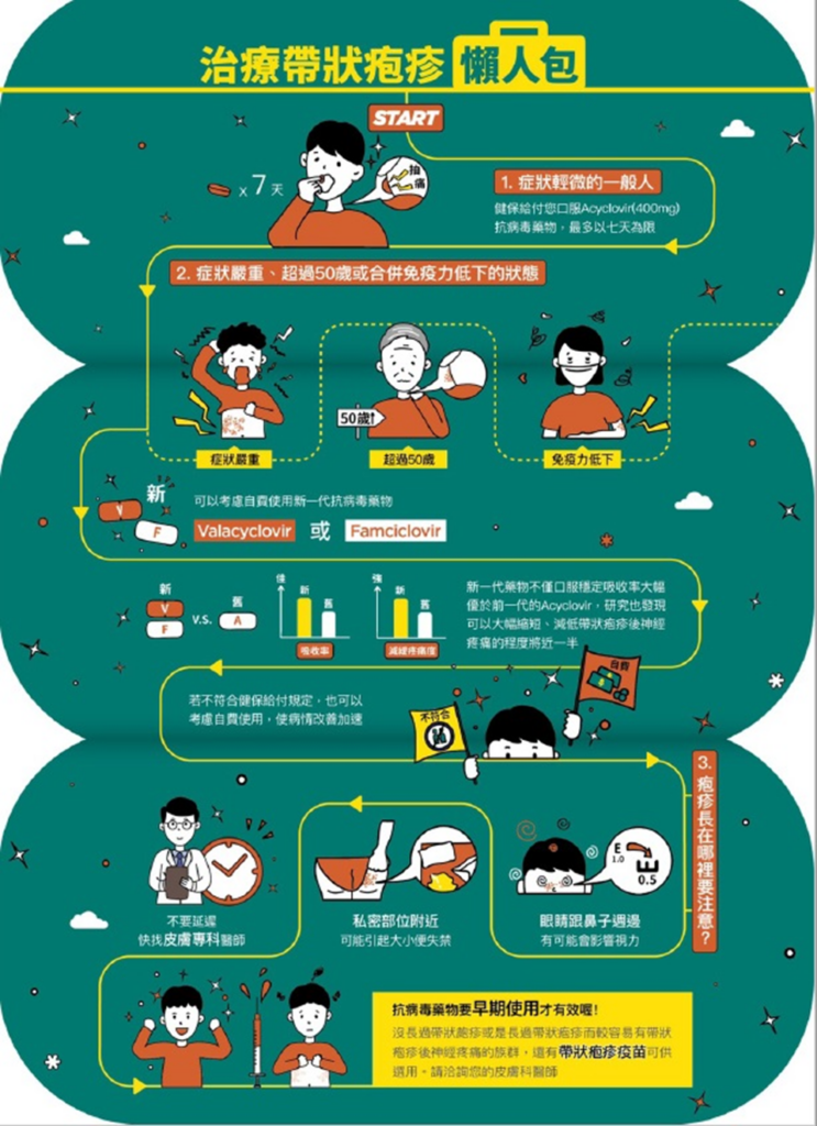 107年12月1日起,健保署為保障帶狀疱疹病患基本治療,放寬口服Acyclovir(400mg)抗病毒藥物給付條件,帶狀疱疹病人、單純性疱疹及水痘病人都可受惠。