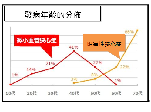 顧名思義這個微小血管狹心症是因為冠狀動脈小血管發生痙攣缺氧而引起的疾病。一般的狹心症是大的冠狀動脈發生阻塞而引起的症狀。冠狀動脈造影檢查可看到直徑3mm的左右冠狀動脈甚至到0.3mm的小血管分枝有否阻塞.,微小血管狹心症就是分佈在心臟肌肉中0.3mm以下的小血管痙攣缺氧引起的狹心症.。這個病名1980年代美國就有提出(Microvascular cardiac diease ),但詳細病因、診斷、治療不太清楚。2010年日本循環器學會正式以微小血管狹心症(Microvascular Angina)為命名,將它的臨床、診斷、治療作guide line發表。對一般大眾甚至一般醫師仍是較陌生的病名。它的病因可能和女性賀爾蒙Estrogen的分泌量減少有關。我們知道女性賀爾蒙具有血管擴張的作用,更年期的女性賀爾蒙分泌急劇減少造成血管容易痙攣。臨床上的病患70%為女性佔多數,特別是45歲到55歲更年期的女性容易出現症狀(圖一)。統計上發現更年期女性有10%會罹患微小血管狹心症,.月經不順的10-20幾歲少女也會發病,而且日本人比其他種族更容易發生。統計上的數據和就診的醫師有否知道到此病也有關,畢竟它是近幾年才被提出的新疾患。其他的睡眠不足、過勞也是發病的一要因。