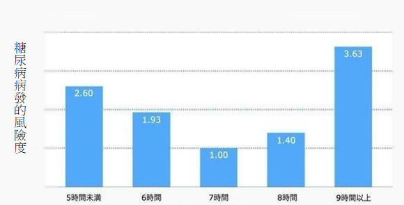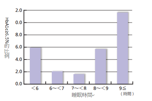 反之睡眠障礙會造成血糖代謝發生異常,是造成糖尿病發病的危險因子。統計學上發現睡眠時間小於6小時或大於9小時的人其HbA1c值大於6.5%的的比例較高(圖1)。睡眠時間小於5小時的糖尿病發病風險是睡眠7小時的2.6倍,睡眠時間大於9小時的糖尿病發病風險為7小時的3.63倍。睡眠時數長短與糖尿病發病風險呈現U型分布(圖2)。睡眠時間是以7小時最好,小於5-6小時或大於9小時都會增加糖尿病發病風險。