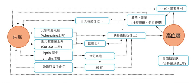 睡眠不足會造成成長賀爾蒙、腎上腺素、 cortisol分泌增加而使葡萄糖的耐性變差,胰島素的阻抗性上升造成血糖容易上升。