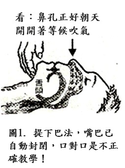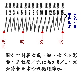 第4招 馬上輕提下巴口對鼻用力吹氣(這是快速連續動作),並連續壓胸。此等同有咳嗽〝魔術〞效果。口對鼻吹氣是全世界教科書正確、最簡單(容易學習永遠記憶及執行)、衛生(吹完完全無感覺)、自然通道、暢通無阻、高效率的吹氣法,任何反對者都是不對!人類是用鼻子呼吸,吹氣一定是吹鼻子。